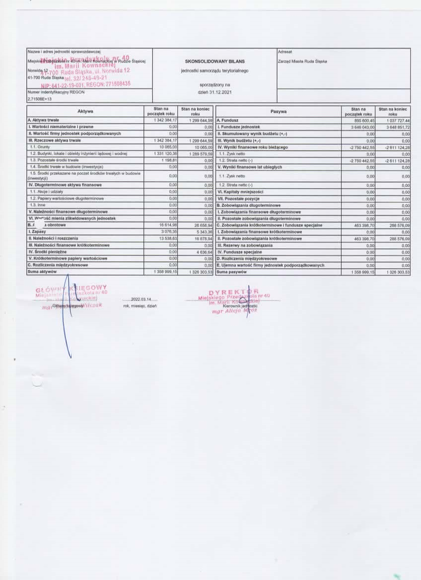 Sprawozdanie finansowe za 2021rokUtworzono: 08 czerwiec 2022 | Poprawiono: 08 czerwiec 2022 | Opublikowano: 08 czerwiec 2022 | Barbara Wilczek | Drukuj | E-mail | Odsłony: 1269 Sprawozdanie finansowe za 2021 rok (...) Załączniki: bilans.png[ ]657 kB2022-06-08 21:06 bilans skonsolidowany.png[ ]436 kB2022-06-08 21:06 informacja dodatkowa str 1.png[ ]430 kB2022-06-08 21:06 informacja dodatkowa str 2.png[ ]468 kB2022-06-08 21:06 informacja dodatkowa str 3.png[ ]451 kB2022-06-08 21:06 informacja dodatkowa str 4.png[ ]411 kB2022-06-08 21:06 rachunek zysków i strat.png[ ]530 kB2022-06-08 21:06 zestawienie zmian w funduszu jednostki.png[ ]481 kB2022-06-08 21:07