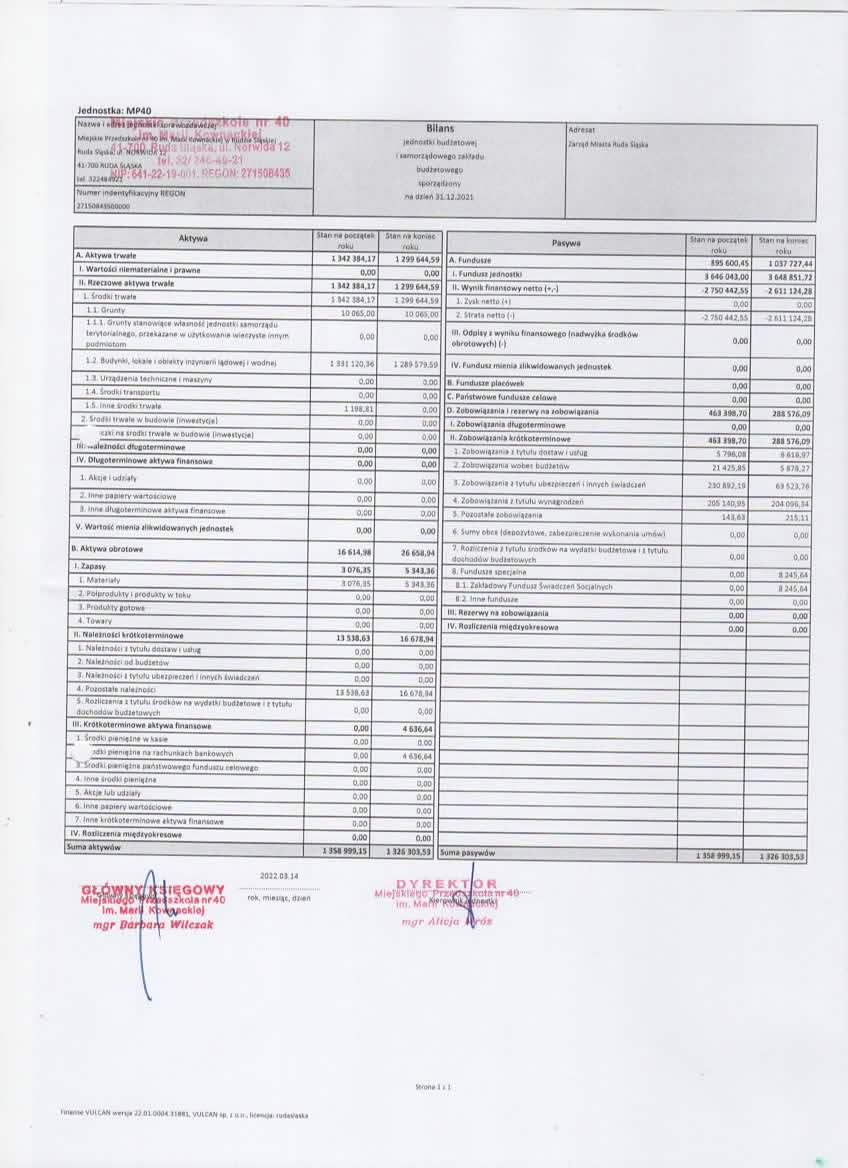 Sprawozdanie finansowe za 2023 rokUtworzono: 09 maj 2024 | Poprawiono: 09 maj 2024 | Opublikowano: 09 maj 2024 | Barbara Wilczak | Drukuj | E-mail | Odsłony: 681 Sprawozdanie finansowe za 2023 rok (...) Załączniki: bilans.pdf[ ]270 kB2024-05-09 18:19 Informacja dodatkowa__Miejskie Przedszkole nr 40 im. Marii Kownackiej w Rudzie Ś[ ]265 kB2024-05-09 18:19 rachunek zysków i strat.pdf[ ]267 kB2024-05-09 18:19 zestawienie zmian w funduszu.pdf[ ]262 kB2024-05-09 18:19