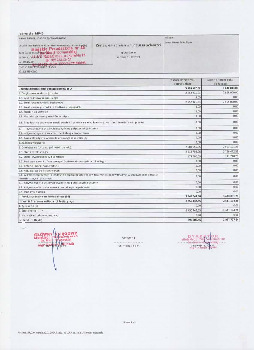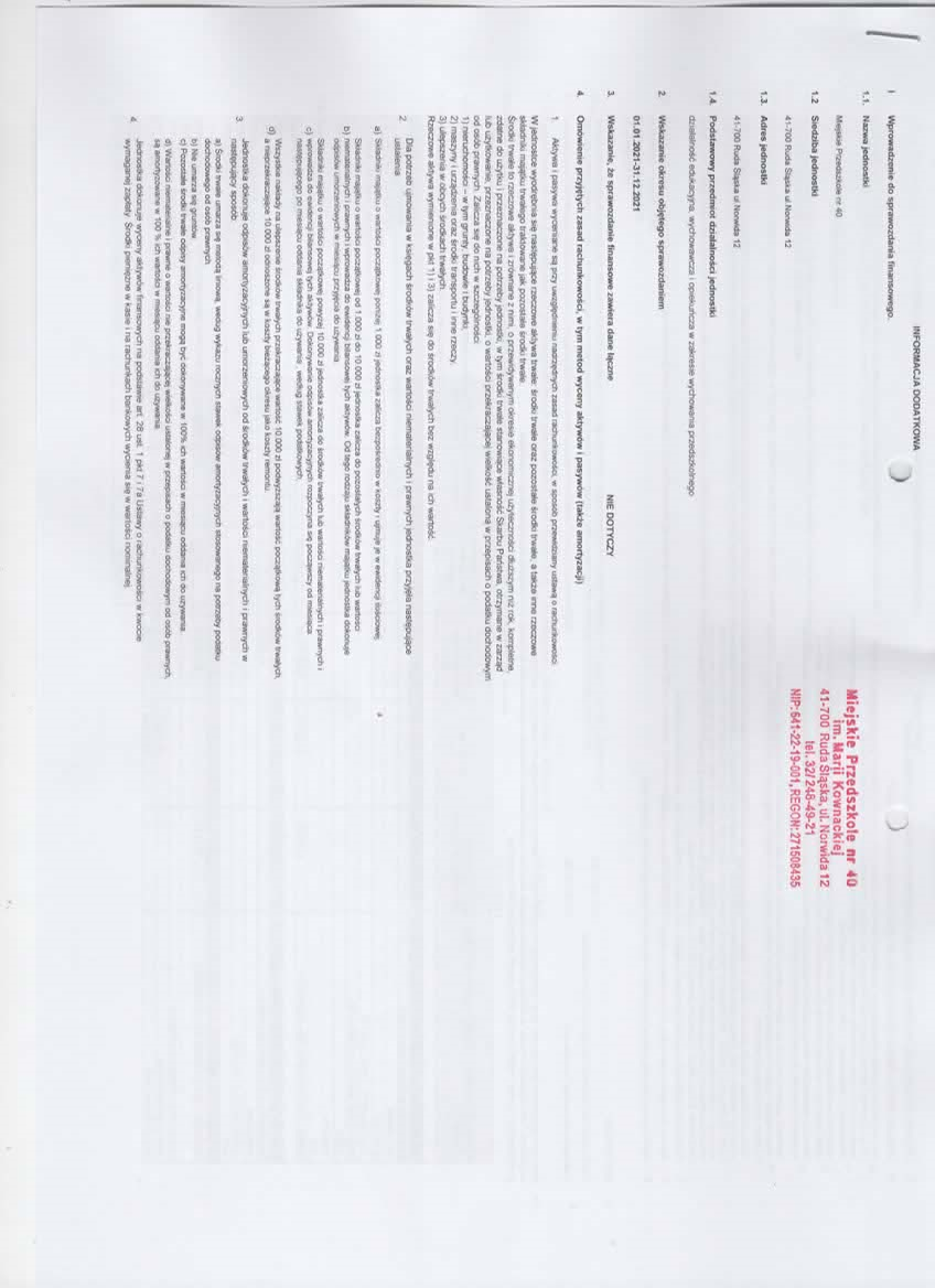 Sprawozdanie finansowe za 2024 rokUtworzono: 05 maj 2025 | Poprawiono: 05 maj 2025 | Opublikowano: 05 maj 2025 | Barbara Wilczak | Drukuj | E-mail | Odsłony: 312 Sprawozdanie finansowe za 2024 rok (...) Załączniki: bilans za 2024r..pdf[ ]270 kB2025-05-05 18:55 Informacja_dodatkowa_za_rok_2024__Miejskie_Przedszkole_nr_40_im__Marii_Kownackie[ ]267 kB2025-05-05 18:55 rachunek zysków i strat za 2024r..pdf[ ]267 kB2025-05-05 18:55 zestawienie zmian w funduszu za 2024r.pdf[ ]262 kB2025-05-05 18:56